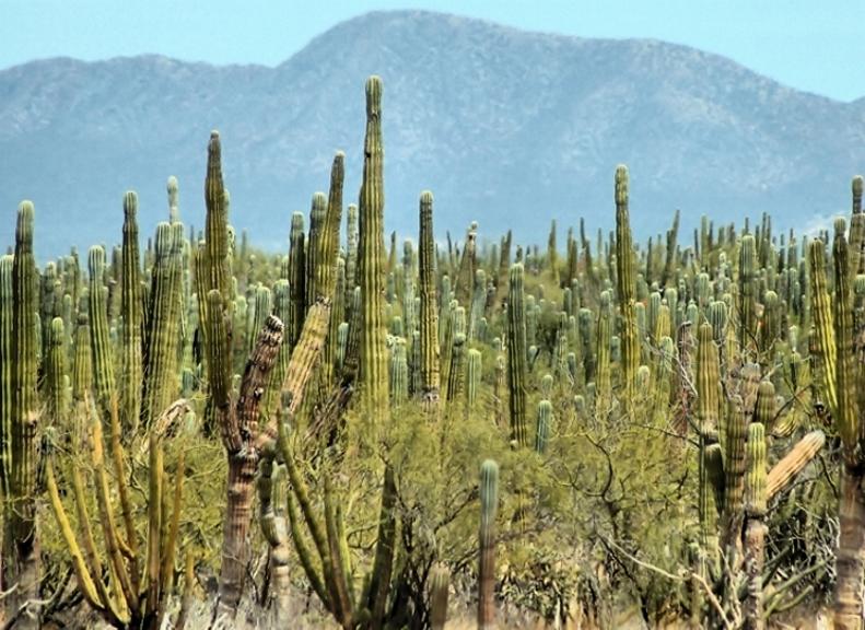 The ecological system here is considered to be recently evolved with a number of endemic species. The lower elevations are dominated by desert and arid condition plants. This includes the world’s largest species of cactus, the cardón cactus, which can reach heights of 15m. Other plant species include mesquite, chironola, lechuguilla, nopal and barrel cactus, choyas, paloadan and pitahaya. The higher elevations have forests of pine and holm oak with some deciduous forests, with leaves falling in the dry season, generally no taller than fifteen meters. Wildlife in the desert areas is restricted to birds, reptiles and small to medium mammals such as rabbits and coyotes. Upper elevations with more vegetation can have wild sheep, pumas and other wild cats, raccoons, deer, and foxes. Marine species include whales, seals, dolphins, gray whales, manta rays and sea turtles.